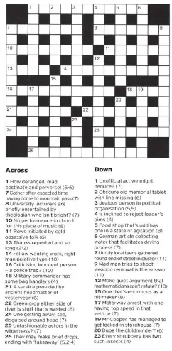 Cryptic crossword No 28,265 | Crosswords | The Guardian 14.10.2020 · Cryptic crossword No 28,265. Skip to main content. ... Cryptic Prize Weekend ... Obstructive international organisation attended by soldier wearing flashy stuff (10) 17, 19. Cryptic crossword - Wikipedia A cryptic crossword is a crossword puzzle in which each clue is a word puzzle. Cryptic crosswords are particularly popular in the United Kingdom, where they originated, Ireland, Israel, the Netherlands, and in several Commonwealth nations, including Australia, Canada, India, Kenya, Malta, New Zealand, and South Africa.Compilers of cryptic crosswords are commonly … purpose Crossword Clue | Wordplays.com Answers for purpose crossword clue, 4 letters. Search for crossword clues found in the Daily Celebrity, NY Times, Daily Mirror, Telegraph and major publications. Find clues for purpose or most any crossword answer or clues for crossword answers. › crosswords › crypticCryptic crossword No 28,511 | Crosswords | The Guardian Jul 29, 2021 · Cryptic crossword No 28,511. Skip to main content. Advertisement. ... They make good stuff that keeps theatre ventilated (9) 16. In disarray, hunts made opposing camps (4,3,2) 18.